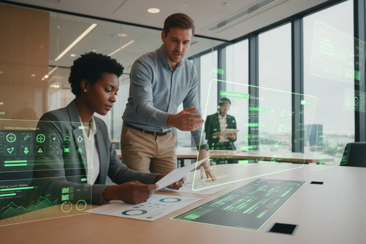 • Équipe diverse dans un bureau moderne analysant des indicateurs de risque fournisseur avec repères visuels verts montrant alertes, tendances, criticité, monitoring continu et plans d’escalade pour anticiper les crises supply chain.
