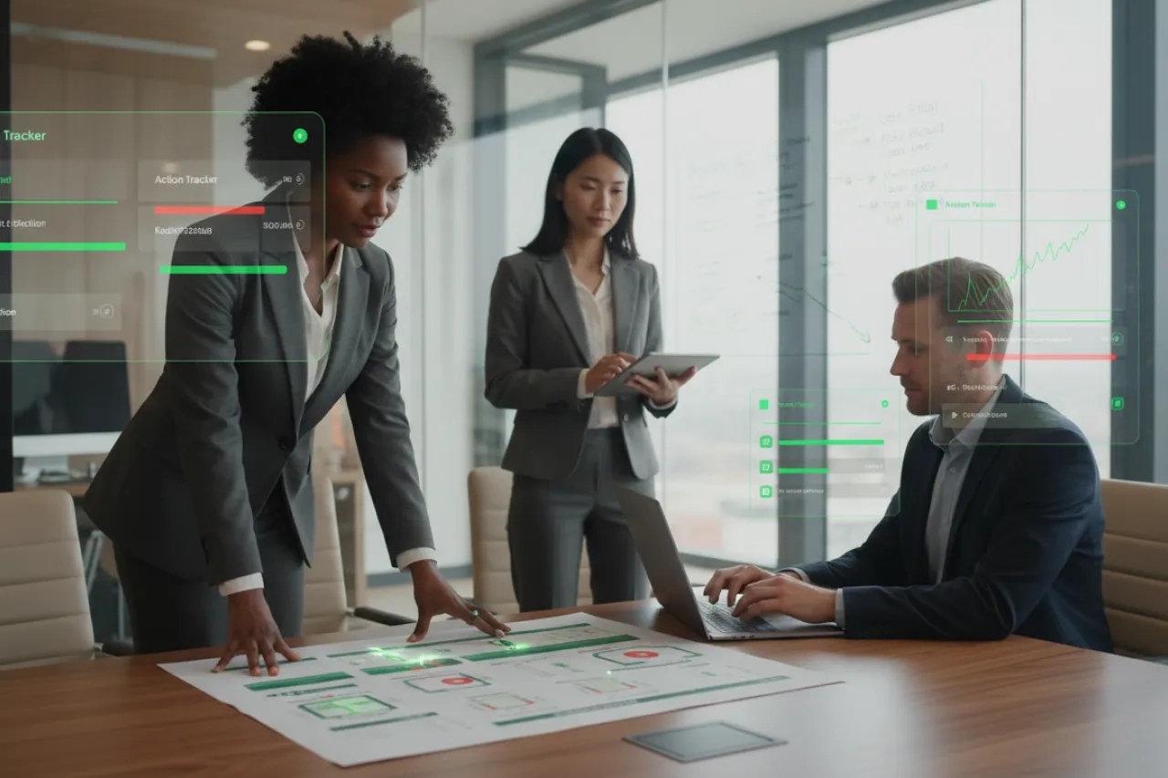 • Dirigeante et équipe en salle de réunion moderne analysant un tableau de bord risques clair et concis, avec repères visuels verts montrant KRI, seuils d’alerte, tendances, plans d’action et priorités de décision pour la direction.